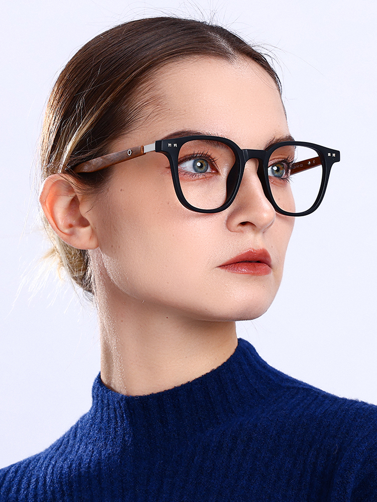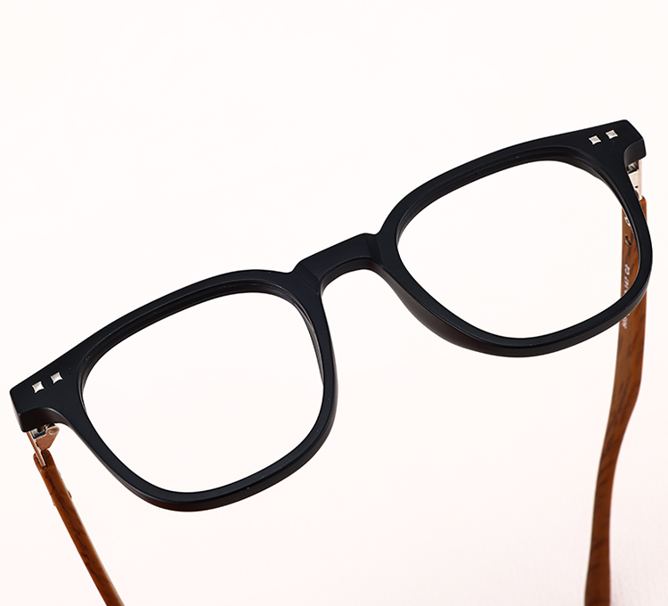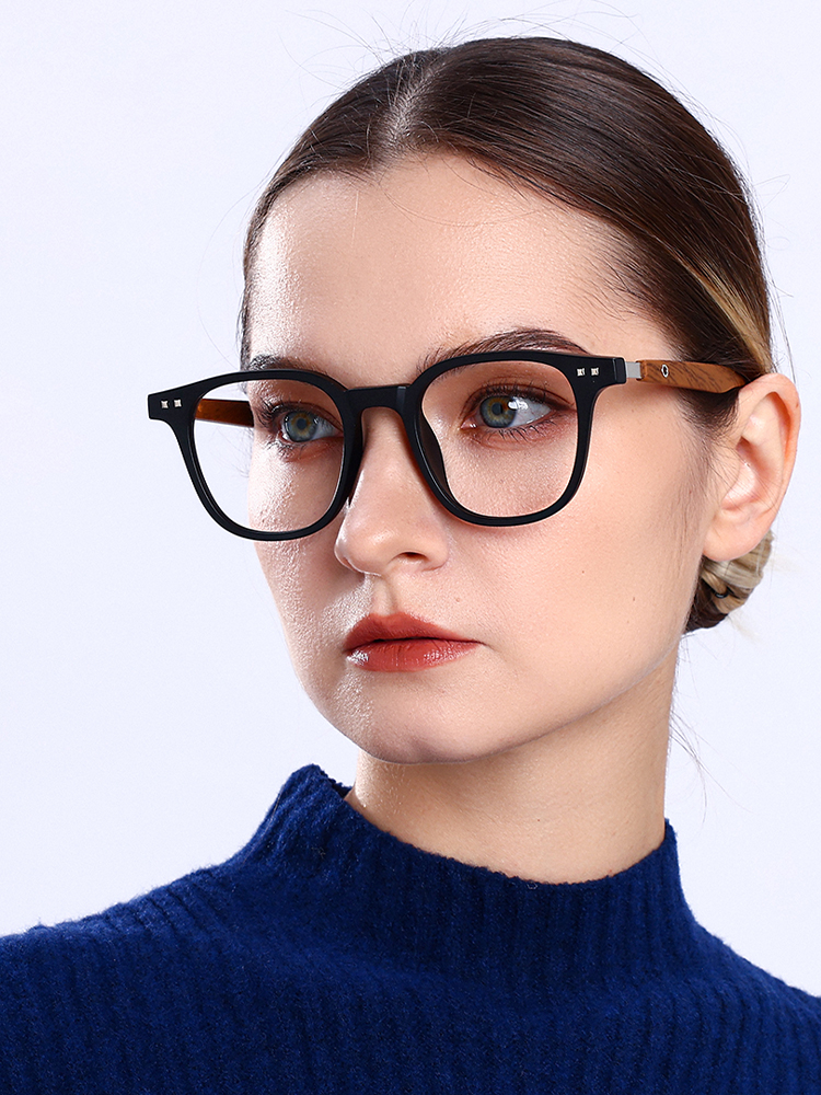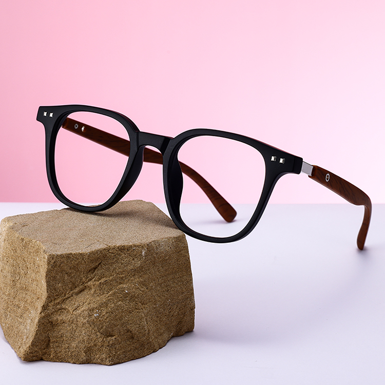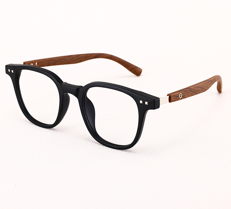 Wood-grain temples add a refined, textured finish.