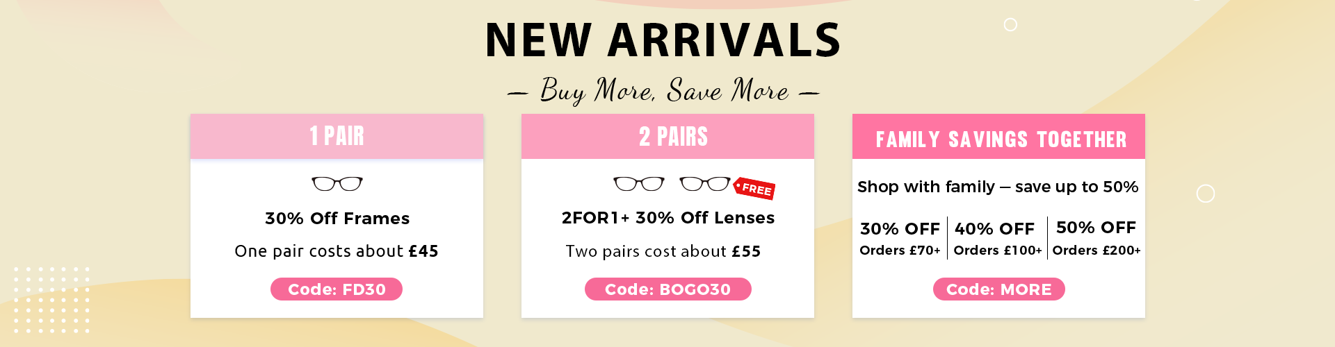 Add 2+ pairs to basket. Apply code at checkout → cheaper frame free, plus 30% off lens upgrades.