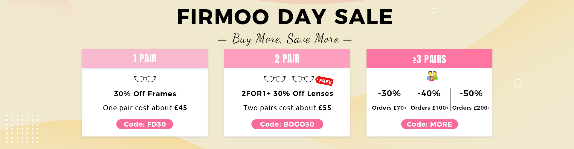 Add 2+ pairs to basket. Apply code at checkout → cheaper frame free, plus 30% off lens upgrades.